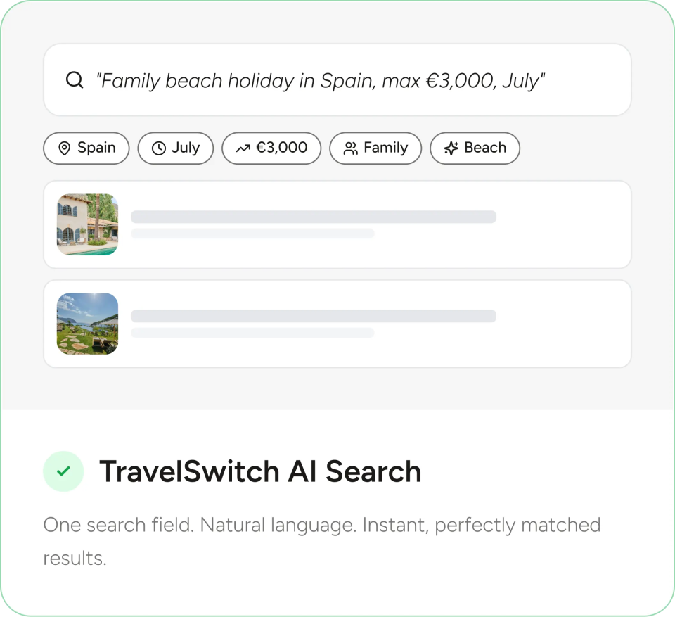 Give your customers a search that understands them. "A beach weekend under €1,000 in March" - and your platform delivers exactly that.