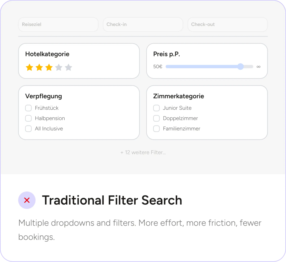 Traditional search forces customers through dropdowns, date pickers, and endless filters. They know what they want - but your interface makes them work for it.