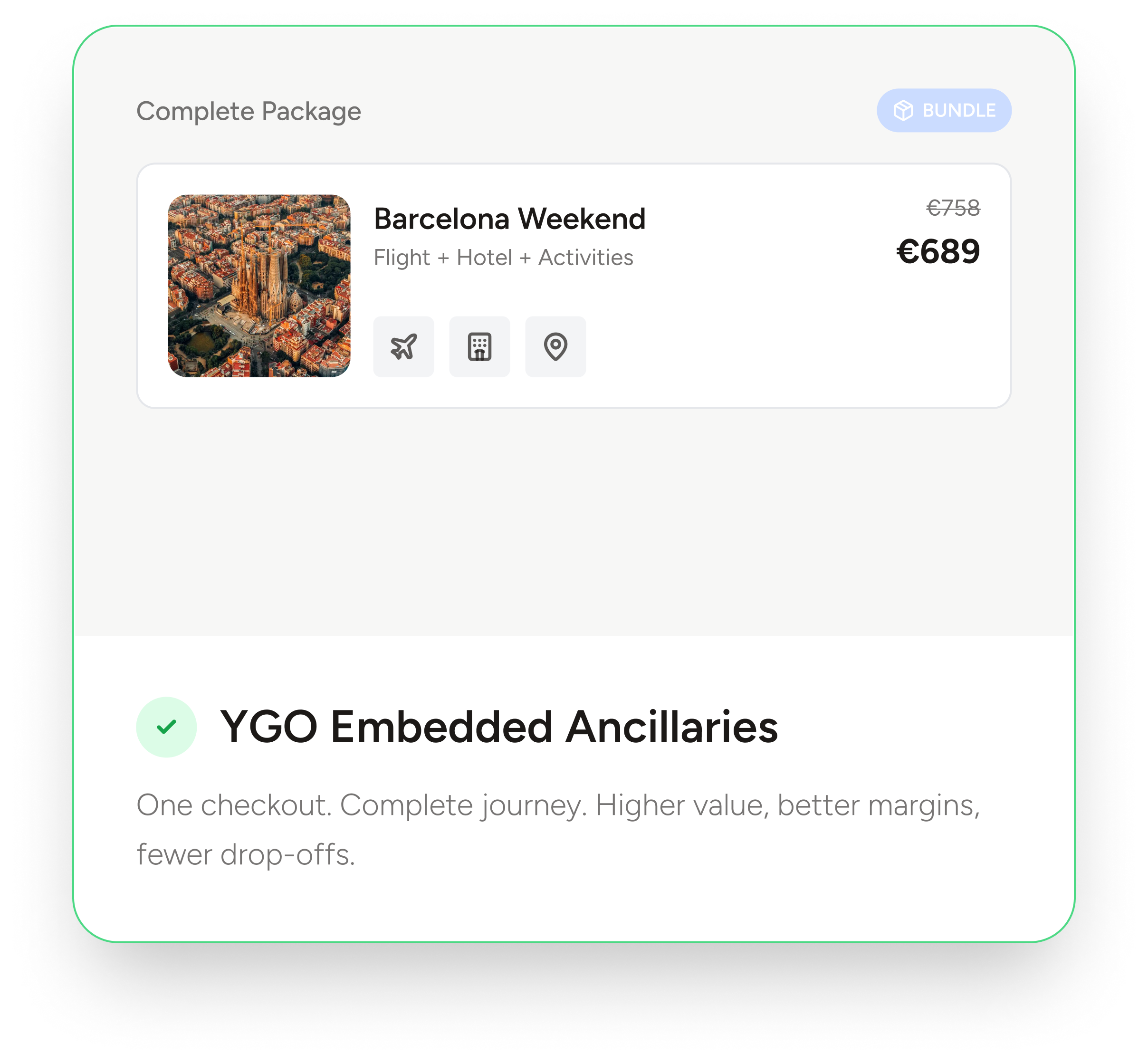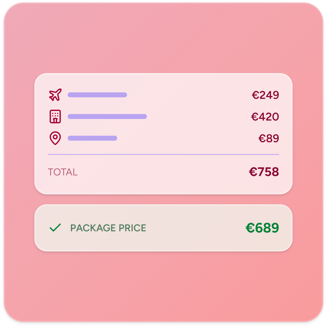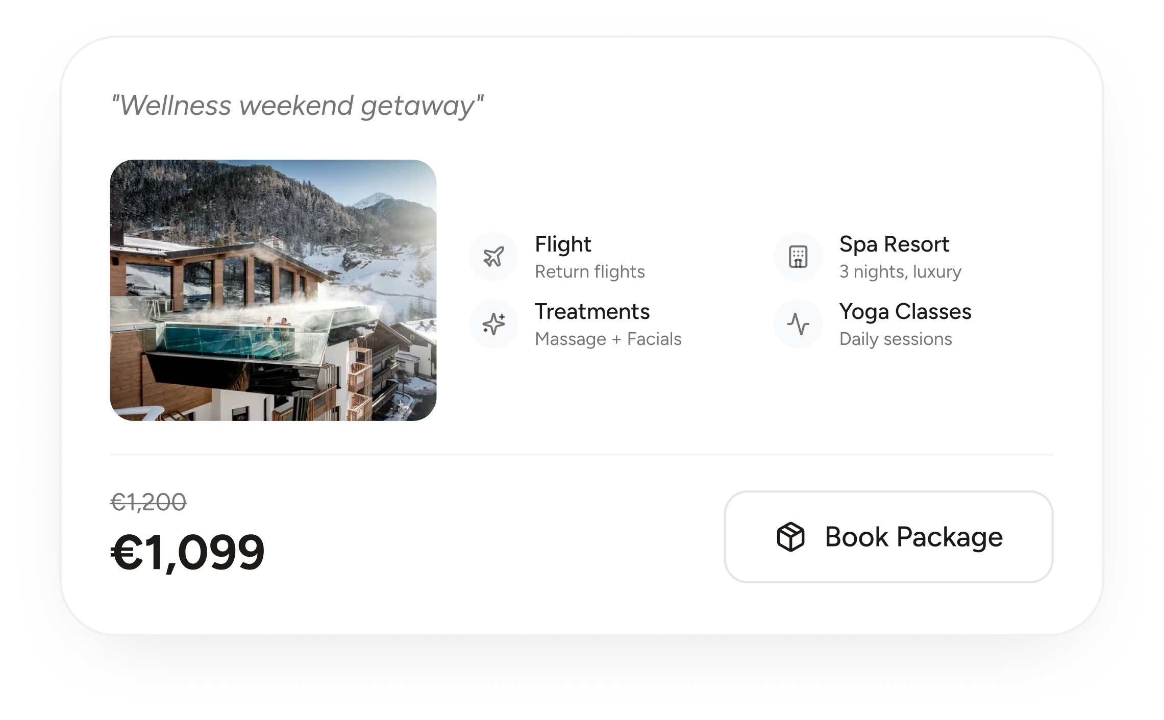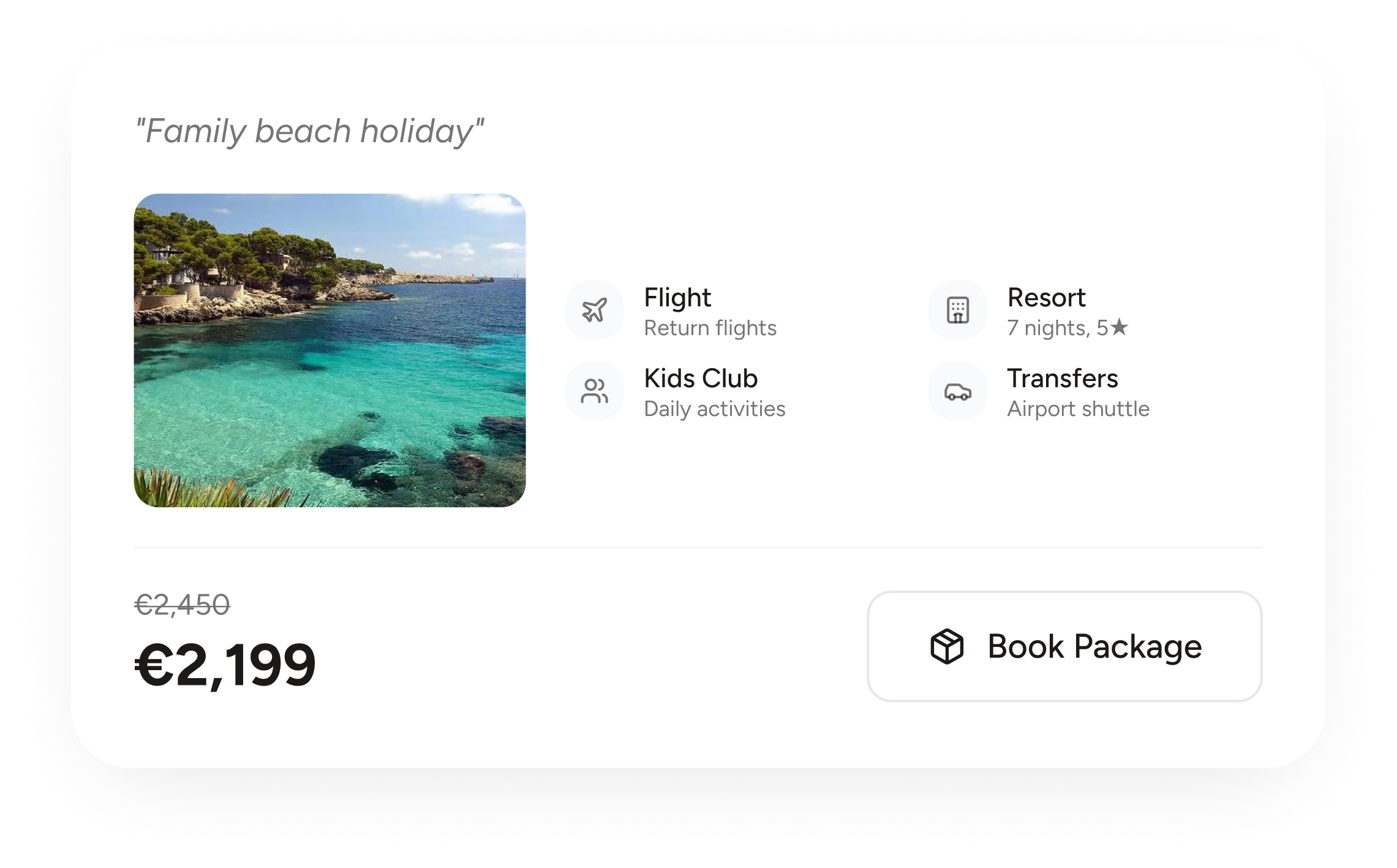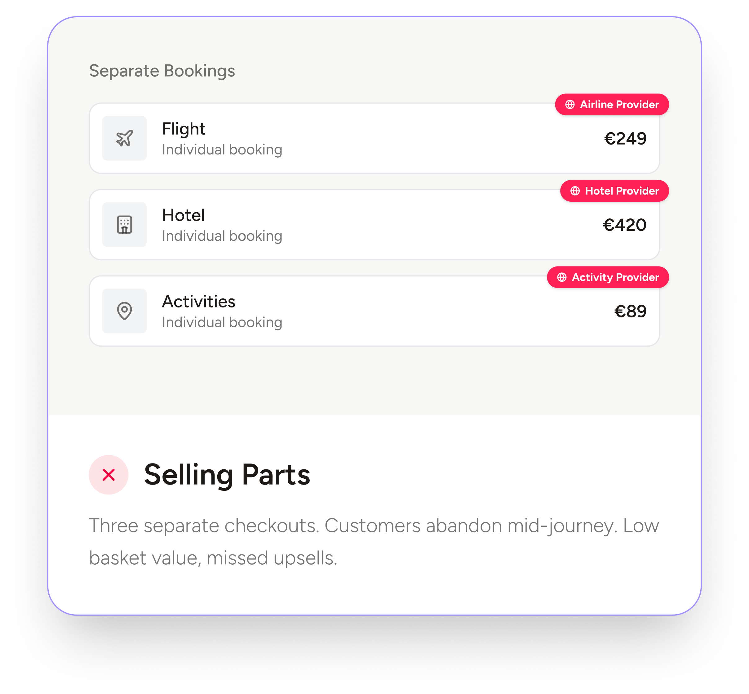 Selling flights, hotels, and cars as separate items forces customers to piece together their own trip. They see a list of parts—not a journey. Conversion drops when you don't offer a complete, bookable experience.