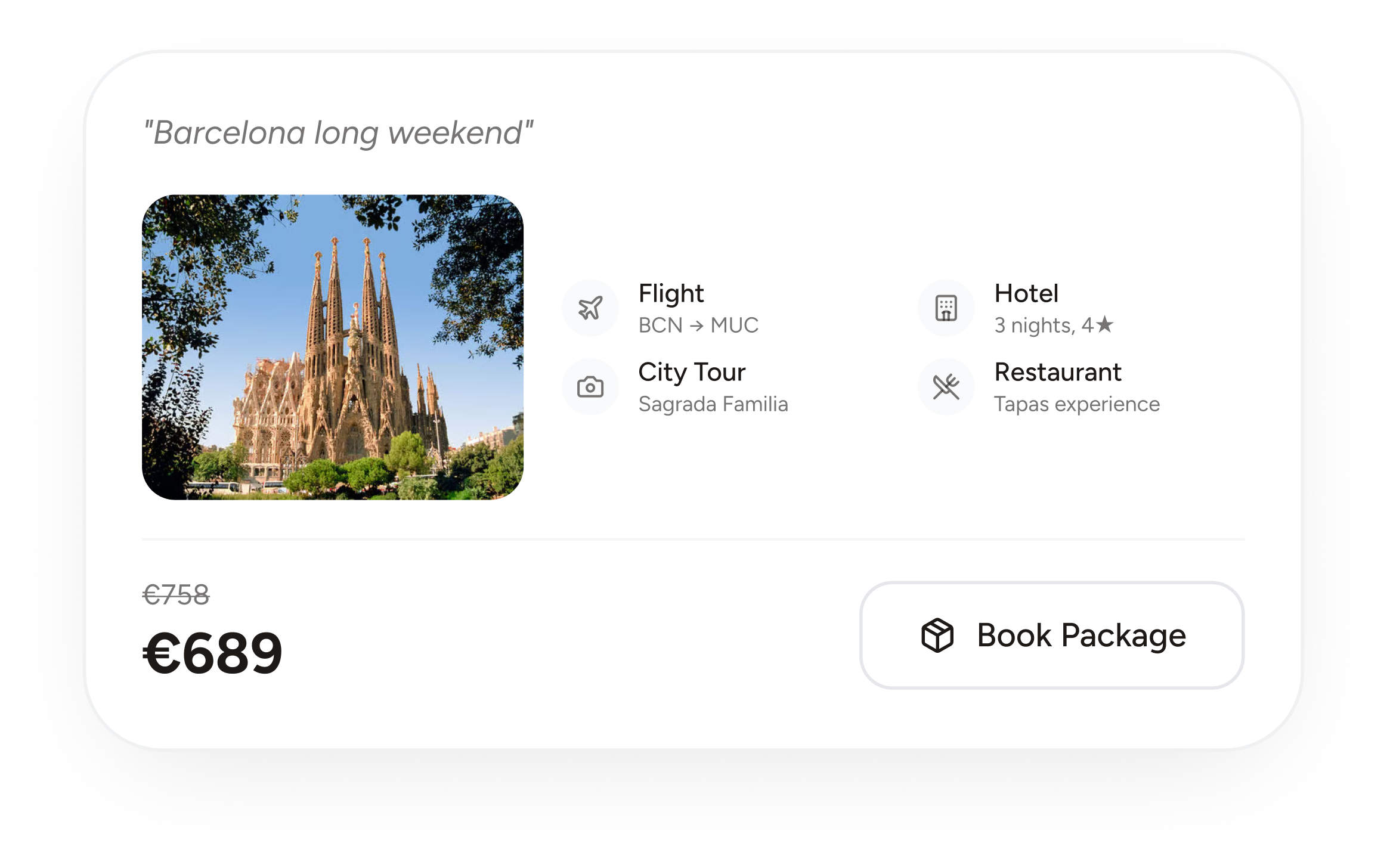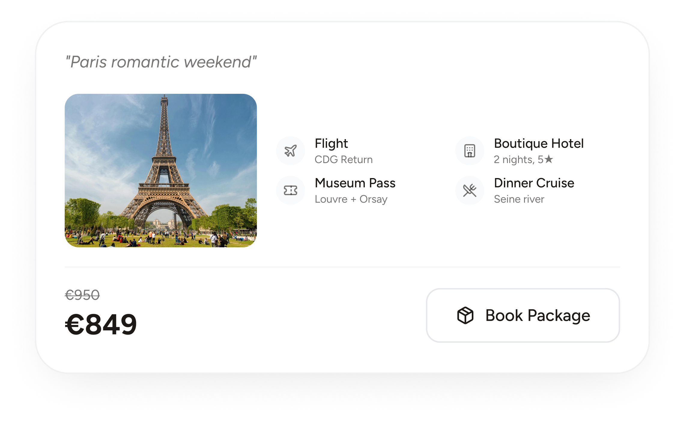From natural language or structured input to bookable packages in seconds. Connected to your inventory and fully automated.