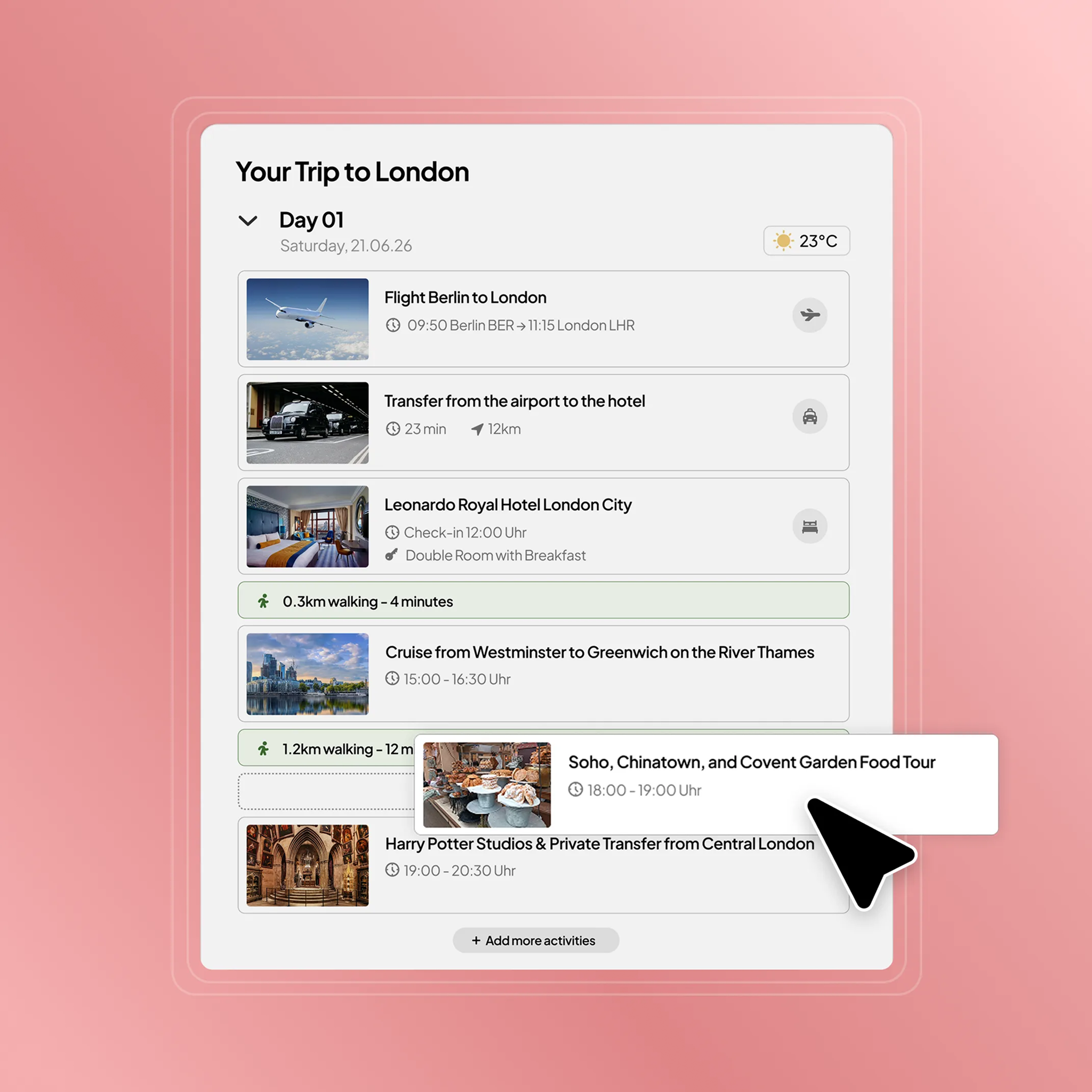 Enable your partners to sell complete journeys, not just flights or rooms. Curated packages that build themselves from your inventory—ready to book in one click.
